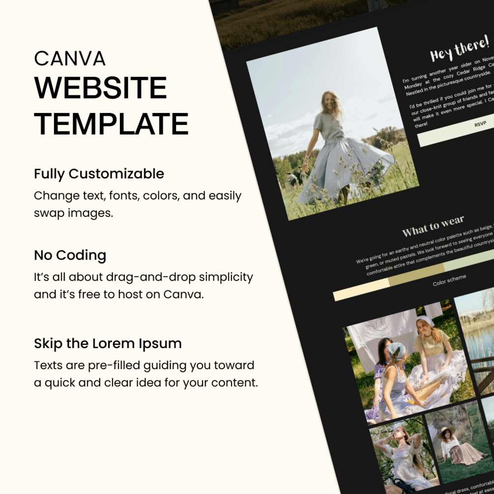 This web template is crafted exclusively using Canva’s free version. Its user-friendly interface allows you to effortlessly tweak fonts, colors, and text to launch your website. Canva hosts the templates for free, but if you’d like to connect your domain name, it’s possible under “Publish Website” - choose between using the existing domain or purchasing a new one